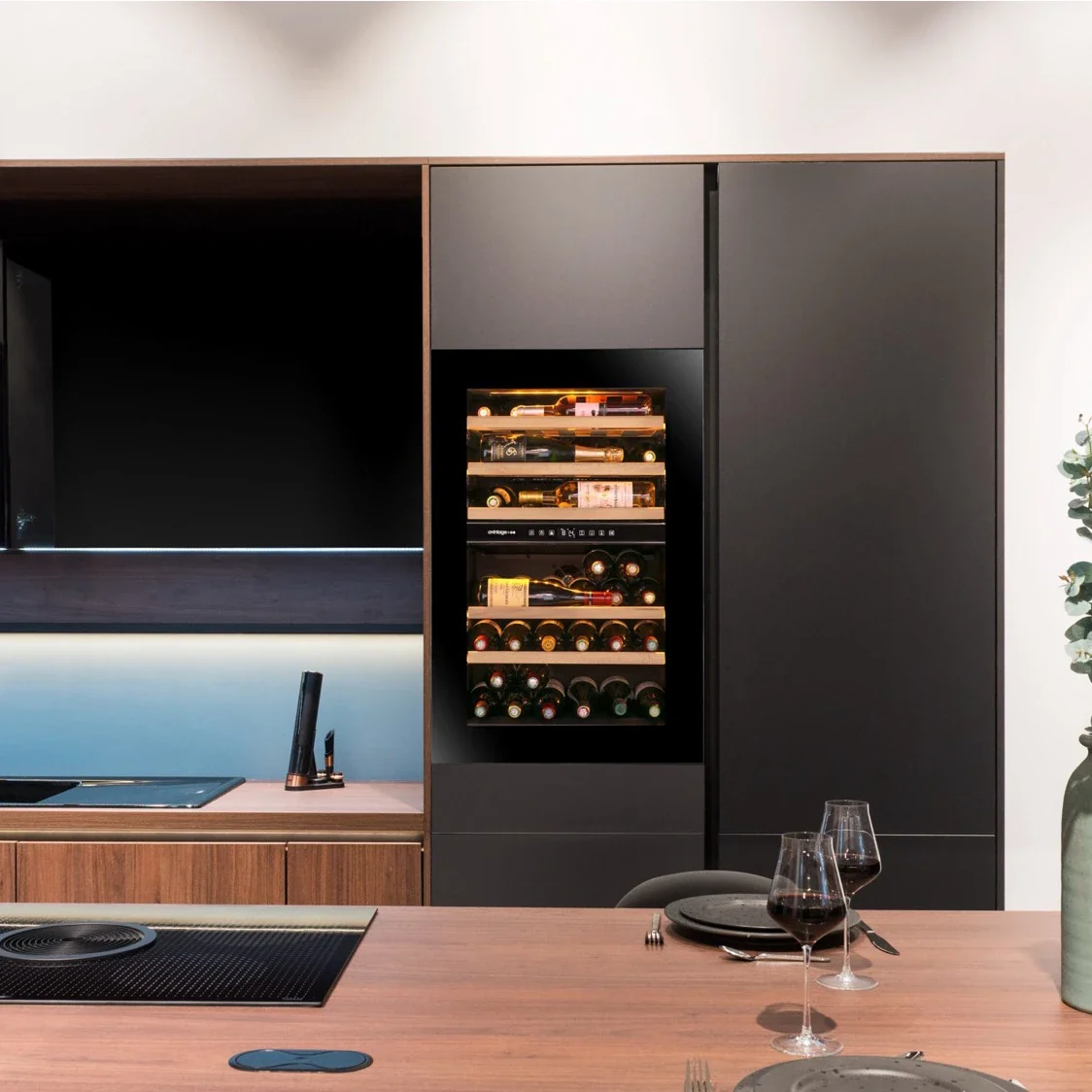 - Dimmerdatav valgus – reguleeritav nelja tugevusega– 25% / 50% / 75% / 100% –, mis võimaldab teil oma veinikollektsiooni ideaalselt esitleda. See funktsionaalne ja stiilne lahendus suurendab teie veinikeldri elegantsi ja annab sellele ainulaadse iseloomu.
